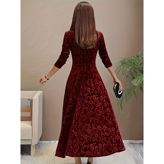 Mette | Dames Fluwelen Maxi Jurk met Vierkante Hals en Bloemenprint